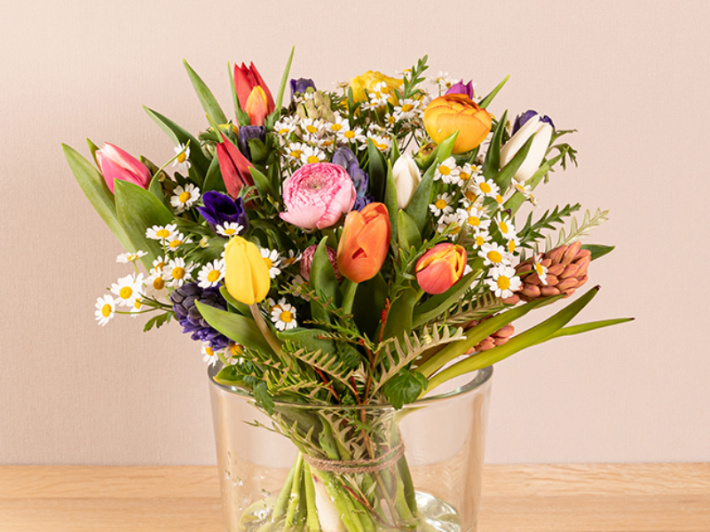Kleurrijk boeket met echte voorjaarsbloemen, waaronder tulpen, in een harmonieuze vorm gebonden.